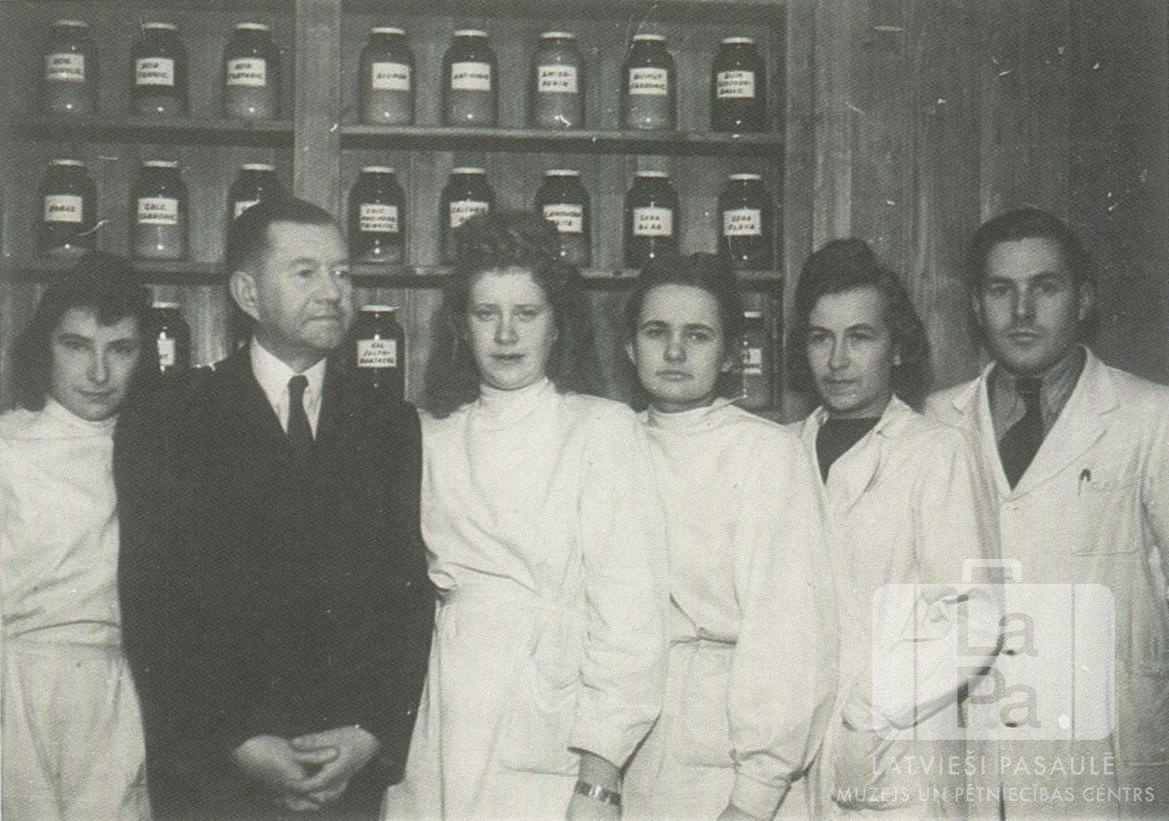 Profesors ? Krēsliņš ar palīgiem Eslingenes nometnes (amerikāņu zonā) aptiekā. Vīrietis uzvalkā stāv kopā ar četrām sievietēm un vīrieti gaišos halātos. Fonā ir plaukti, kuros ir burkas ar uzlīmētām etiķetēm. Otrais no kreisās: ? Krēsliņš (?).