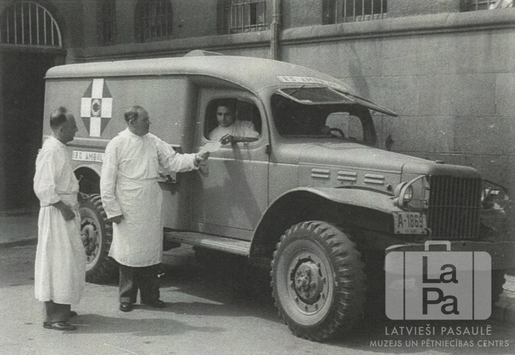 Ātrās palīdzības automašīna Eslingenē (amerikāņu zonā). Blakus automašīnai stāv divi vīrieši gaišos halātos, iespējams, medicīnas darbinieki. Viens vīrietis sēž automašīnas salonā, pasažiera pusē. Priekšā uz automašīnas ir uzraksts: "IRO AMBULANCE", bet uz tās sāna ir simbols. Fonā ir mūra ēka ar restotiem logiem un ieejas durvīm.