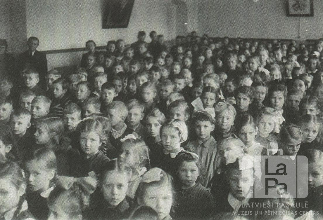 Liela skolēnu grupa rīta lūgšanā pamatskolā Eslingenē (amerikāņu zonā). Skolēni sēž daudzās rindās. Aizmugurē gar telpas sienām stāv pieaugušie. Fonā uz sienām ir divas gleznas.