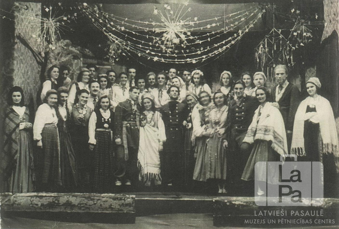 Ģimnāzistu uzvedums Eslingenē (amerikāņu zonā). Jaunieši stāv uz skatuves dažādos tērpos; redzamas sievietes tautastērpos. Skatuves griesti ir dekorēti ar garām virtenēm un rotājumiem.