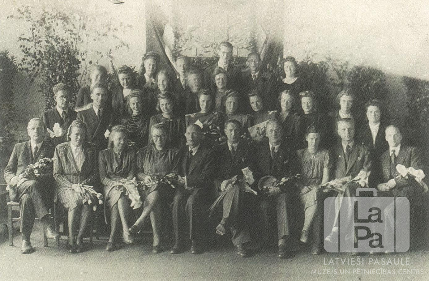 Pirmais ģimnāzijas izlaidums Eslingenē (amerikāņu zonā). Cilvēku grupa vairākās rindās. Pirmā rinda sēž uz krēsliem, ar ziediem rokās. Iespējams, grupā ir redzami absolventi un pasniedzēji. Fonā siena ir dekorēta ar meijām un maziem krūmiem, bet sienas vidū ir Latvijas Valsts ģerbonis un Latvijas Valsts karogs.