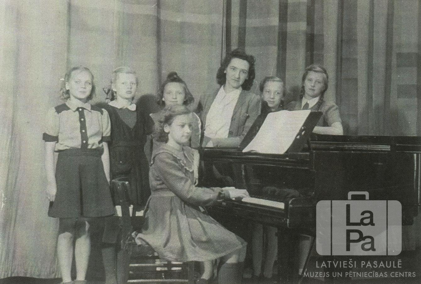 Mūzikas skola Eslingenē (amerikāņu zonā). Priekšā meitene sēž pie klavierēm, aizmugurē stāv piecas meitenes un sieviete. Fonā ir aizkars. Aizmugurē ir redzamas: Ausma Robiņa un Teika Rožkalne.