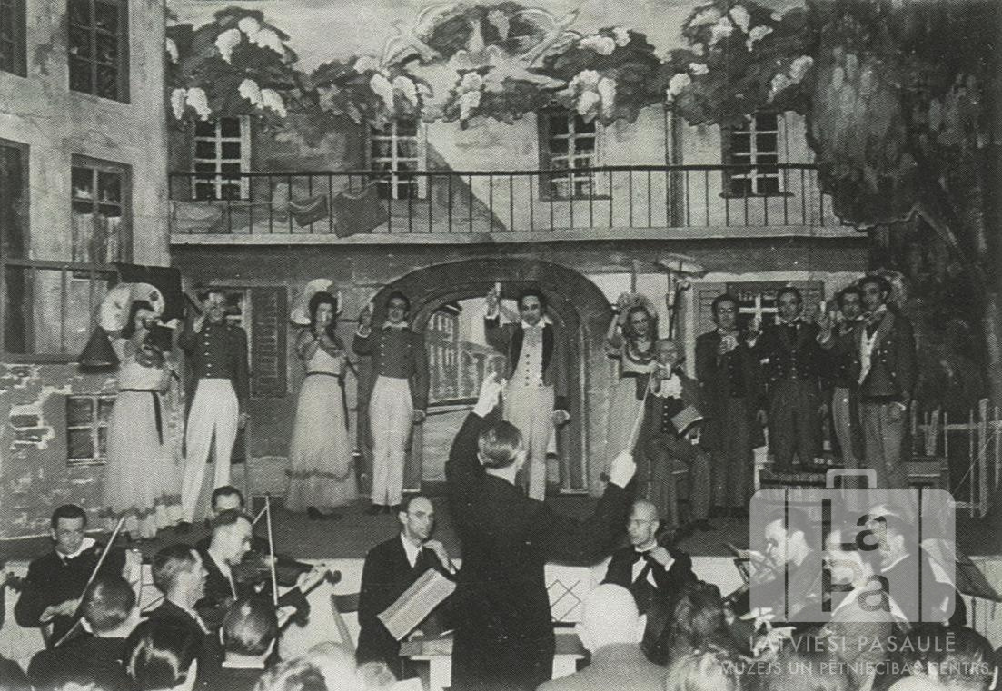 Skatuves uzvedums Eslingenē (amerikāņu zonā). Uz skatuves ir aktieri kostīmos un grimā. Iespējams, tas ir skaņdarba uzvedums "Trīs klavierskaņdarbi". Priekšplānā stāv diriģents ar orķestri. Skatuves gleznotās sienas attēlo divstāvu mūra ēkas ar balkonu un vārtu eju. Priekšplānā, vidū stāv: Aleksandrs Mellis (diriģents). Galveno vīrieša lomu izpilda: ? Rubenis.