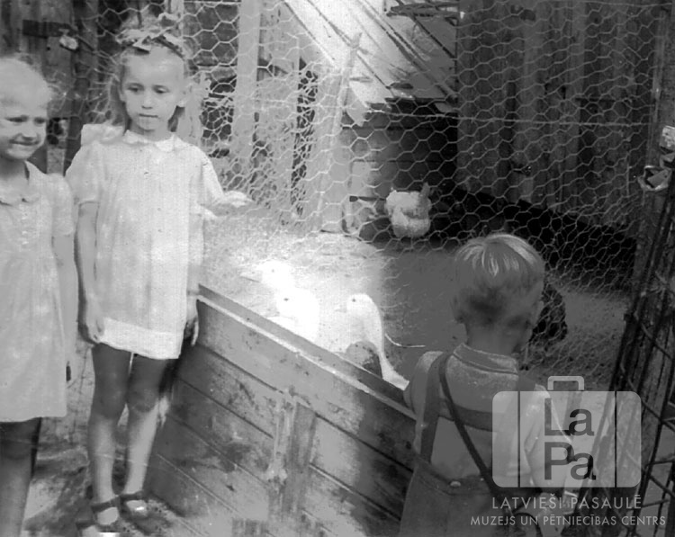 Divas mazas meitenes un zēns stāv pie zosu aploka dzelzs žoga Dedelstorfā (angļu zonā).