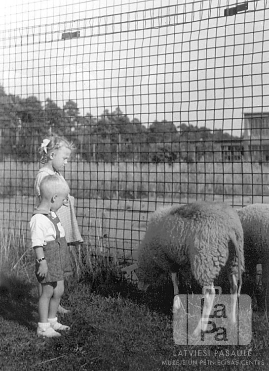 Mazs zēns un meitene kopā ar aitām saulainā dienā stāv blakus augstam, režģotam žogam Dedelstorfā (angļu zonā). Aitas ēd zāli. Fonā aiz žoga ir lauks, ēka un mežs.