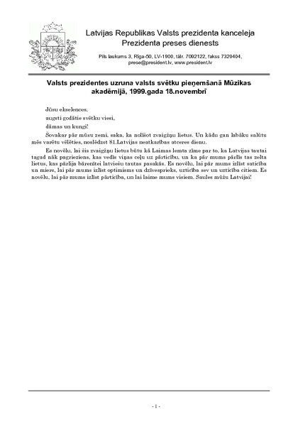 Valsts prezidentes uzruna valsts svētku pieņemšanā Mūzikas akadēmijā, 1999.gada 18.novembrī