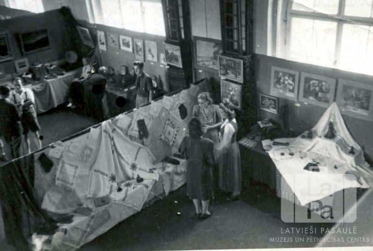 Apmeklētāji pēta amatniecības un rokdarbu izstādi Franku novada Latviešu dziesmu dienu laikā Ansbahas nometnē (amerikāņu zonā). Divos nodalījumos sadalīta telpa, kurā uz galdiem un sienām ir izliktas dažādas segas, šķīvji, zīmējumi un citi darbi. Viena sieviete ir ģērbusies tautastērpā. Skats no augšas.