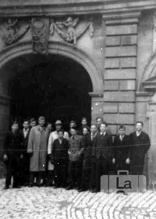 LIelvārdes skautu grupa ar vadītāju uzvalkos un mēteļos stāv uz bruģēta laukuma pie mūra vārtu arkas ekskursijas laikā uz Vircburgas pili (amerikāņu zonā). Mūra vārti augšpusē ir dekorēti ar figūrām.
