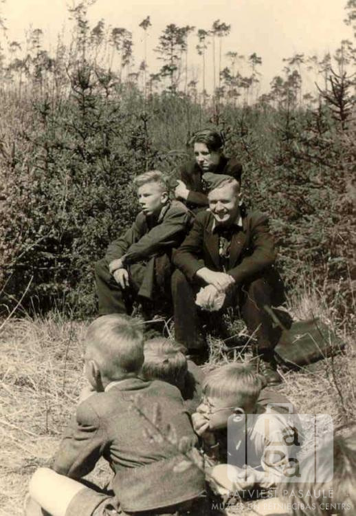 Lielvārdes skauti no Ansbahas (amerikāņu zonā) formastērpos sēž meža malā atpūtas brīdī āra nodarbību laikā 1949. gada vasarā.