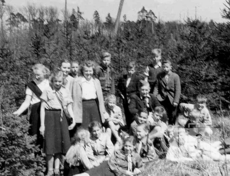 Lielvārdes 44. gaidu vienība un Lielvārdes 15. skautu vienība no Ansbahas nometnes (amerikāņu zonā) vairākās rindās meža malā nodarbību laikā 1949. gada vasarā. Vairāki jaunieši un bērni ir formastērpos.