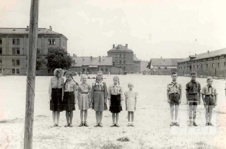 Lielvārdes 44. gaidu vienība un Lielvārdes 15. skautu vienība formastērpos stāv ierindā pie karogmasta, lai pēdējo reizi sveiktu un novilktu Latvijas karogu pirms Ansbahas nometnes (amerikāņu zonā) slēgšanas 1950. gada vasarā. Fonā ir plašs laukums. Laukuma otrā galā ir redzami cilvēki. Laukuma malās ir vairākas mūra ēkas.