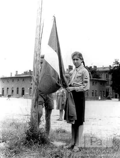 Skauts un gaida formastērpos ar Latvijas Valsts karogu stāv pie karogmasta, lai pēdējo reizi sveiktu un novilktu karogu pirms Ansbahas nometnes (amerikāņu zonā) slēgšanas 1950. gada vasarā. Pasākumā piedalījās Lielvārdes 44. gaidu vienība un Lielvārdes 15. skautu vienība formastērpos. Fonā uz laukuma ir citi skauti; laukuma malā ir divstāvu mūra ēka.