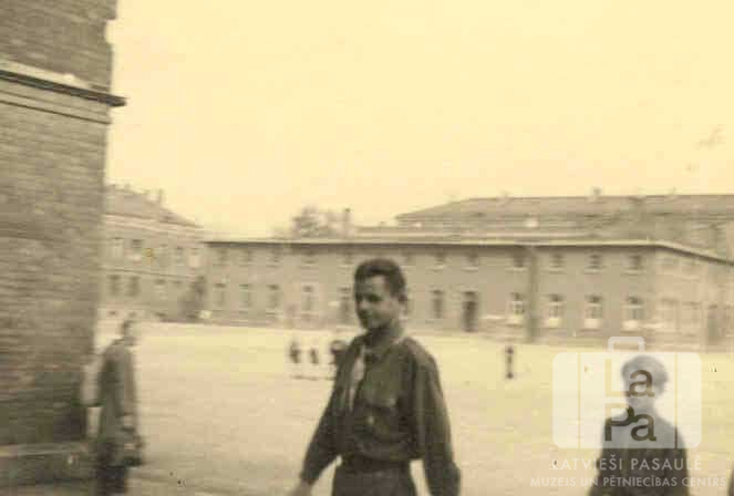 Skauts dodas garām ķieģeļu ēkai pie Ansbahas nometnes laukuma (amerikāņu zonā) 1949. gada vasarā. Vīrietim kreisajā pusē stāv zēns. Aizmugurē pie ēkas stūra un uz laukuma ir redzami cilvēki. Laukuma otrā pusē ir redzamas divstāvu mūra ēkas.