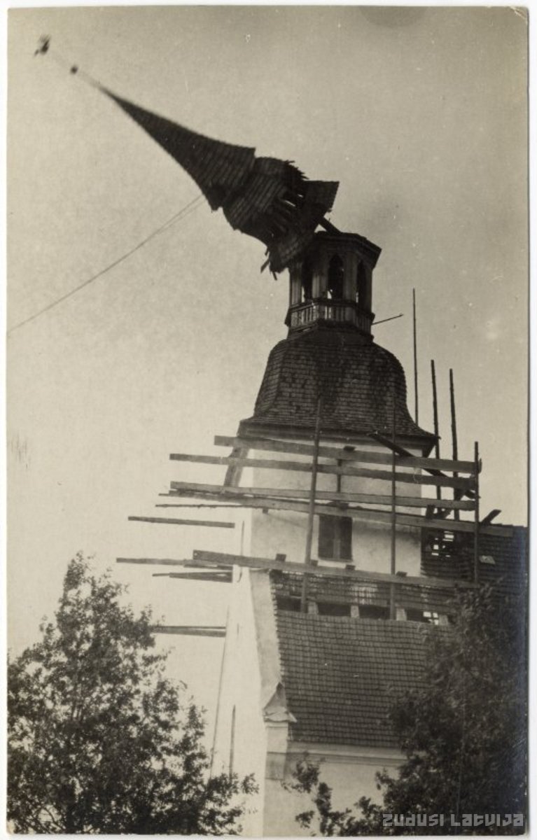 Opekalna luterāņu baznīca. Koka torņa nosvēršanās