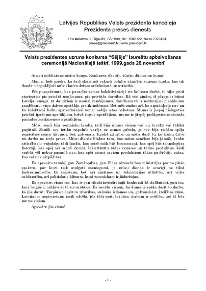 Valsts prezidentes uzruna konkursa “Sējējs” laureātu apbalvošanas ceremonijā Nacionālajā teātrī, 1999.gada 26.novembrī