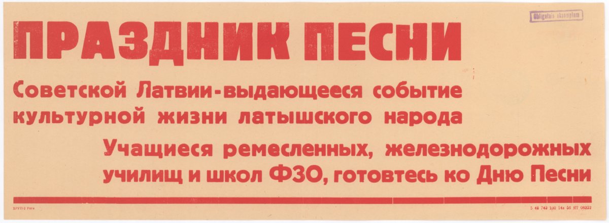 Праздник песни Советской Латвии - выдающиеся событие культурной жизни латышского народа. [attēls] Участиеся ремесленных, железнодорожных училищ и школ ФЗО, готовтесь ко Дню Песни[!] / mākslinieks nezināms