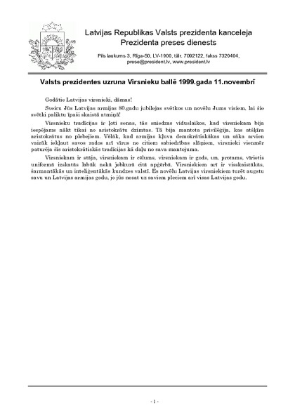 Valsts prezidentes uzruna Virsnieku ballē 1999.gada 11.novembrī