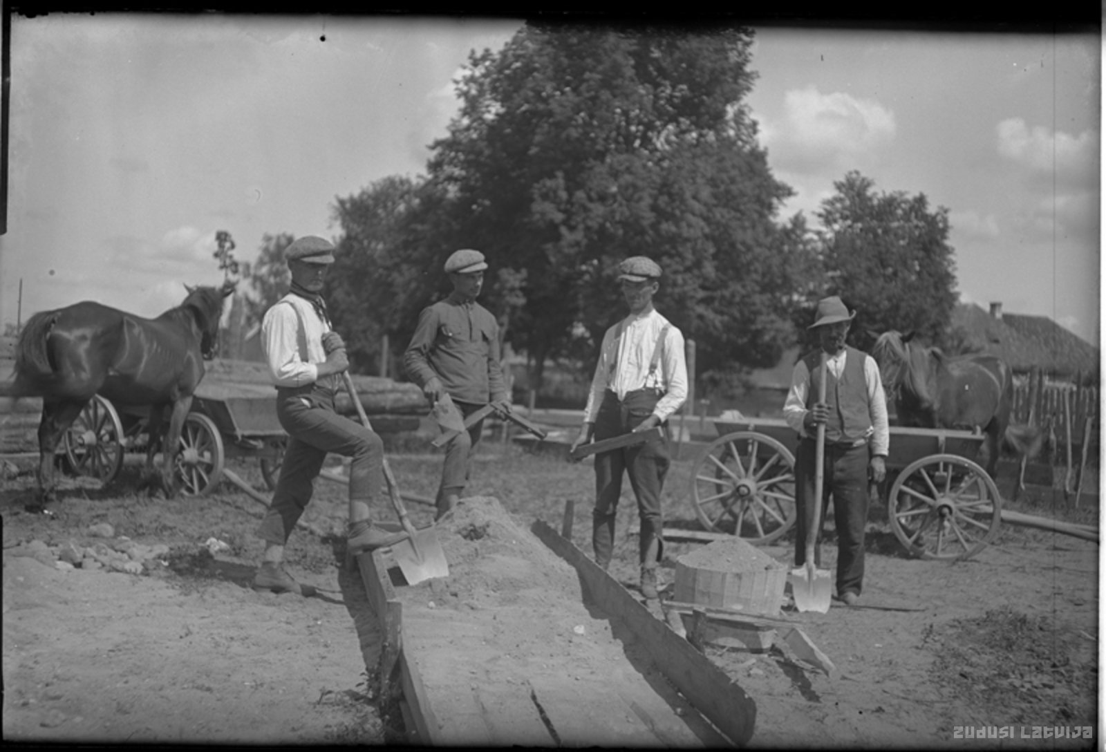Četri vīrieši ar celtniecības instrumentiem