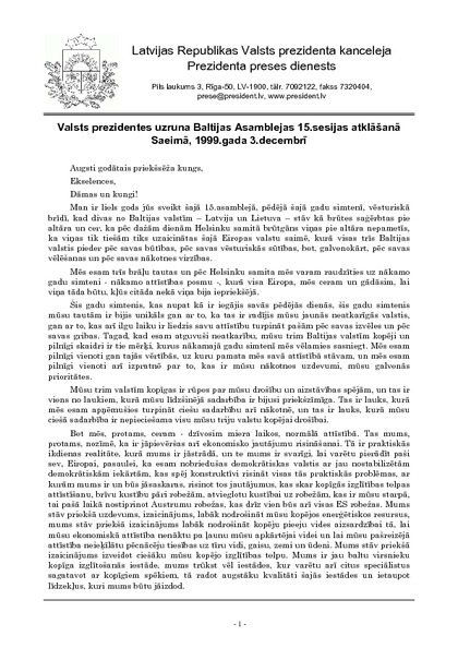 Valsts prezidentes uzruna Baltijas Asamblejas 15.sesijas atklāšanā Saeimā, 1999.gada 3.decembrī