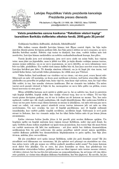 Valsts prezidentes uzruna konkursa “Rakstīsim vēsturi kopīgi” laureātiem Barikāžu dalībnieku atbalsta fondā, 2000.gada 20.janvārī