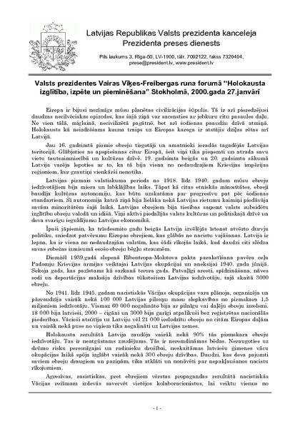 Valsts prezidentes Vairas Vīķes-Freibergas runa forumā “Holokausta izglītība, izpēte un pieminēšana” Stokholmā, 2000.gada 27.janvārī