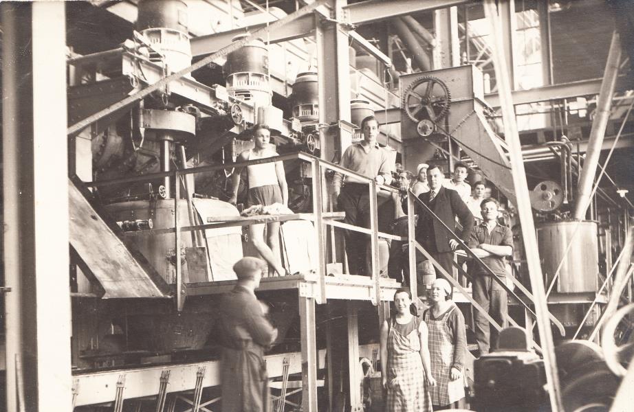 Krustpils cukurfabrikas darbinieki pie fabrikas iekārtām