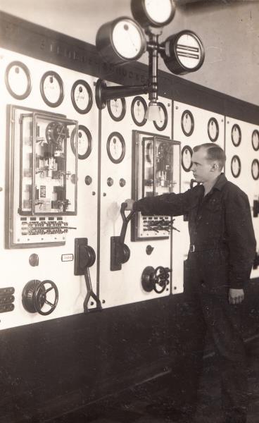 Krustpils cukurfabrikas strādnieks pie turboģeneratoru iekārtām