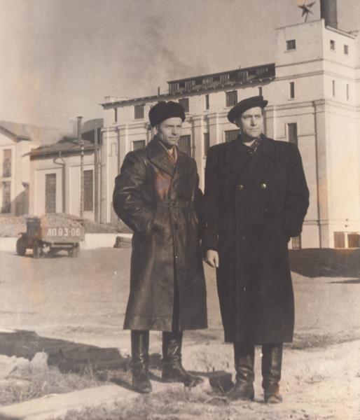 Fabrikas direktors Arvīds Ezeriņš (pa labi) pie cukurfabrikas katlu mājas korpusa