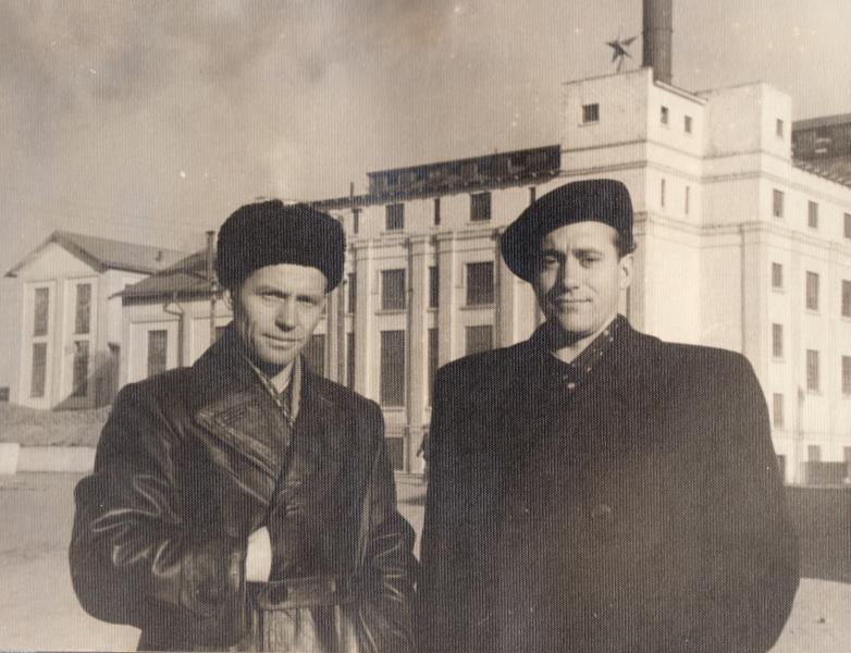 Fabrikas direktors Arvīds Ezeriņš (pa labi) pie cukurfabrikas katlu mājas korpusa