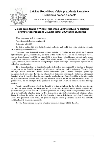 Valsts prezidentes V.Vīķes-Freibergas uzruna balvas “Skaistākā grāmata” pasniegšanā Jaunajā teātrī, 2000.gada 28.janvārī