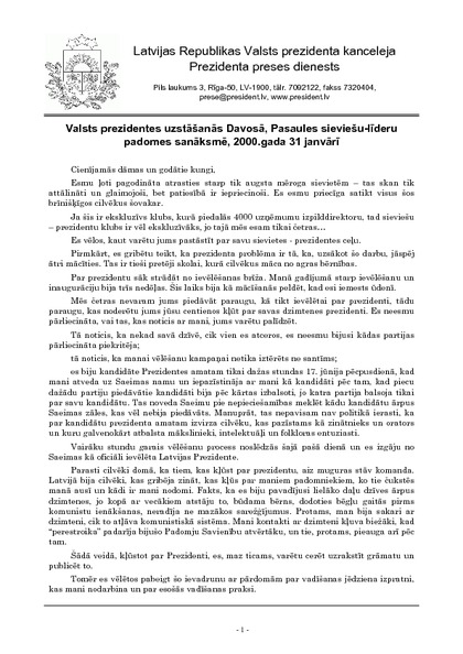 Valsts prezidentes uzstāšanās Davosā, Pasaules sieviešu-līderu padomes sanāksmē, 2000.gada 31 janvārī