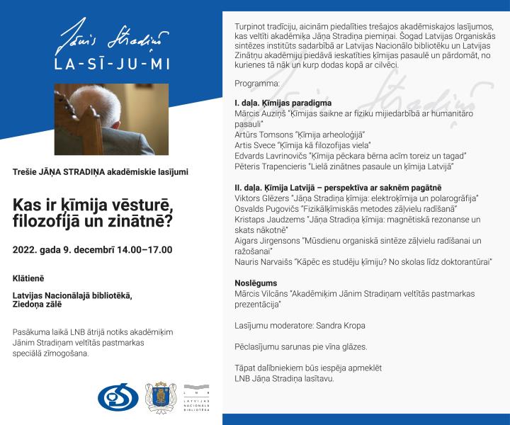 2022. gada 9. decembrī Latvijas Nacionālajā bibliotēkā (LNB) notika akadēmiskie lasījumi "Kas ir ķīmija vēsturē, filozofijā un zinātnē?", kas veltīti akadēmiķa Jāņa Stradiņa (1933–2019) piemiņai. Latvijas Zinātņu akadēmijas, Latvijas Organiskās sintēzes institūta un LNB organizētie lasījumi aicināja ieskatīties ķīmijas pasaulē un pārdomāt, no kurienes tā nāk un kurp dodas kopā ar cilvēci.