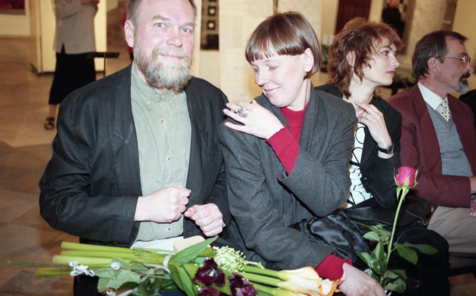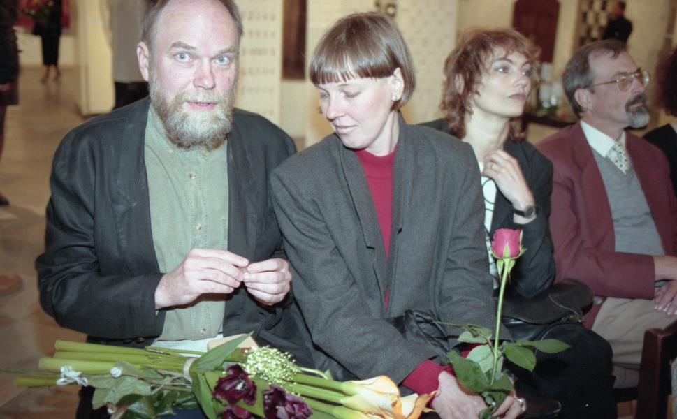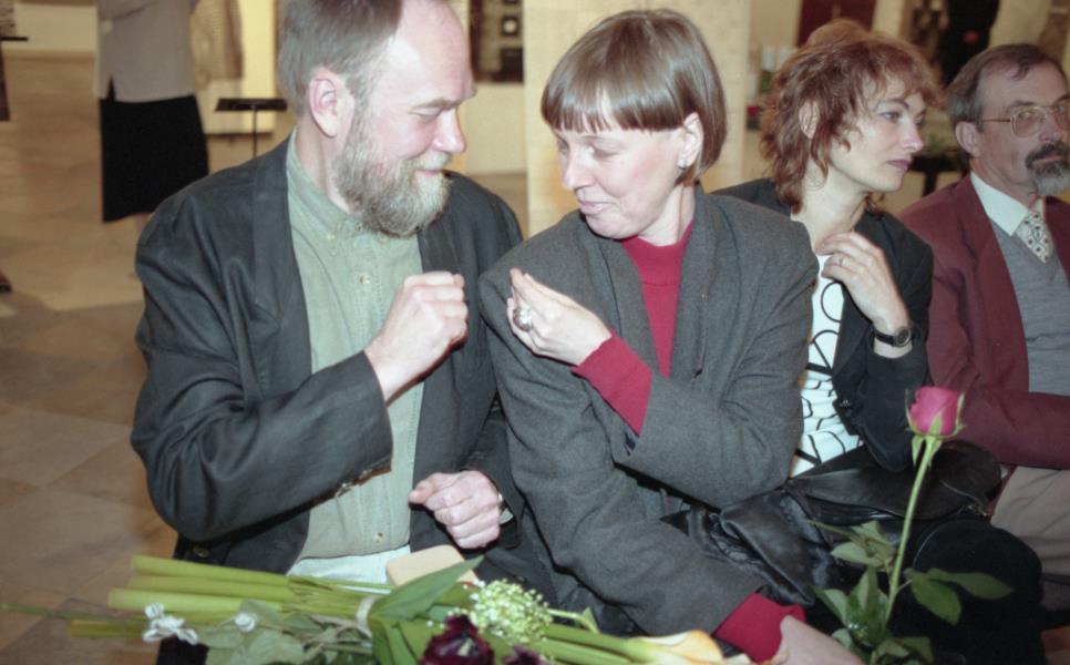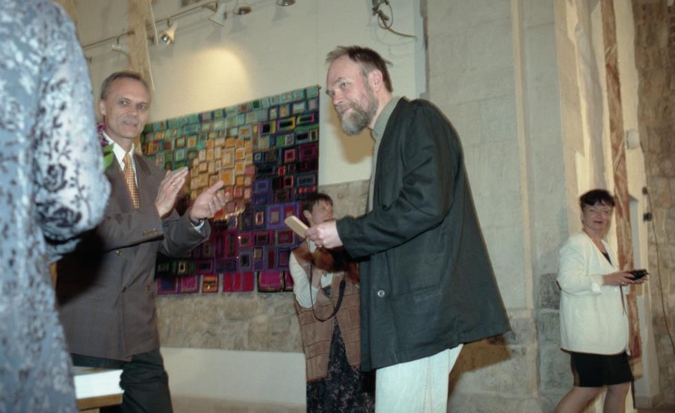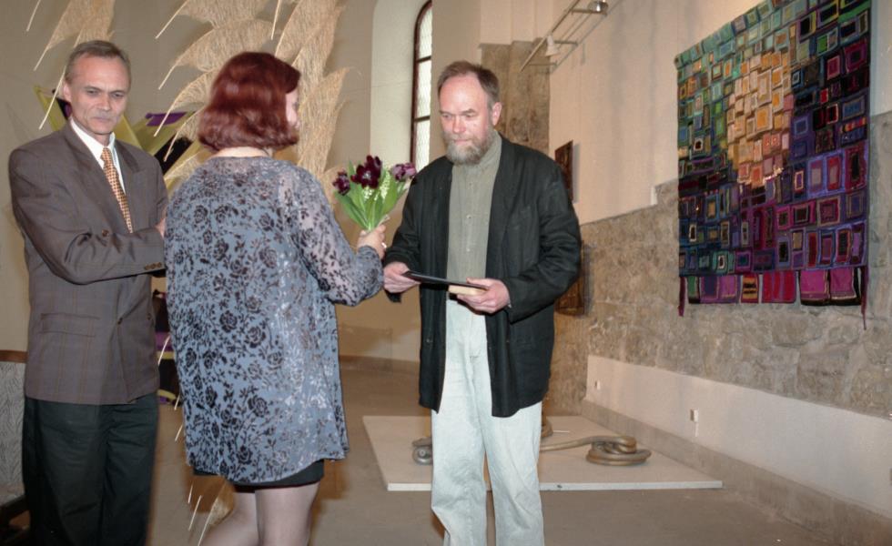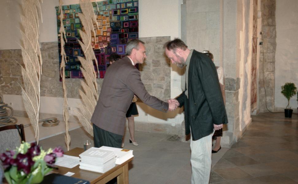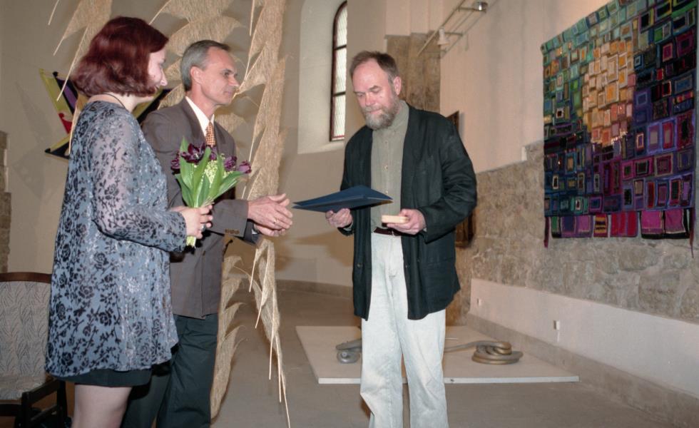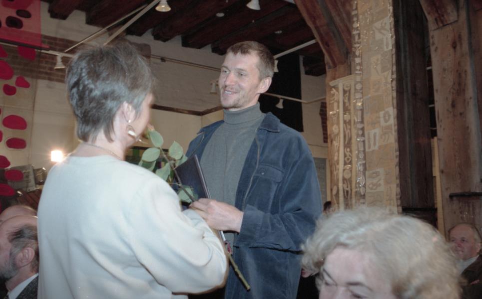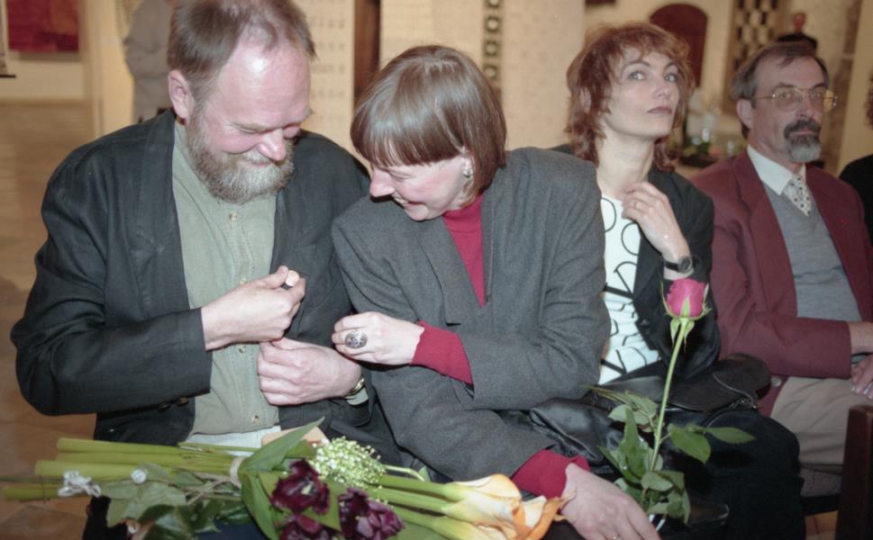 Mākslinieku savienības medaļas pasniegšana Ilmāram Blumbergam. Ilmārs Blumbergs