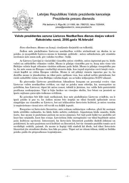 Valsts prezidentes uzruna Lietuvas Neatkarības dienas dzejas vakarā Rakstnieku namā, 2000.gada 16.februārī