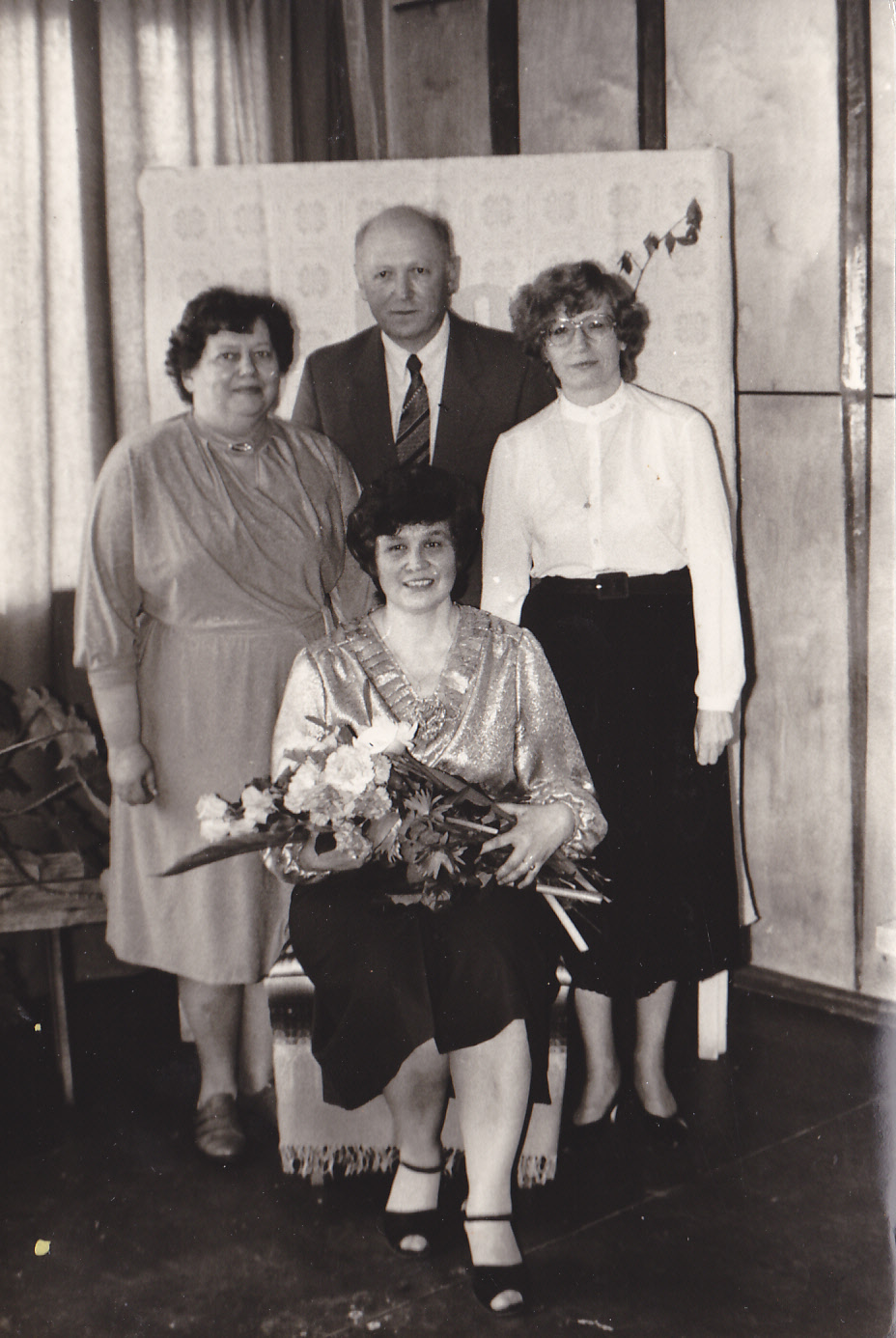 Fabrikas "Limbažu filcs" kadru daļas vadītāja Ņina Bikova jubilejā 1989. gada 21. aprīlī. No kreisās - apsveicēji - Valentīna Cīrule, direktors Modris Andreika, Sarmīte Luste