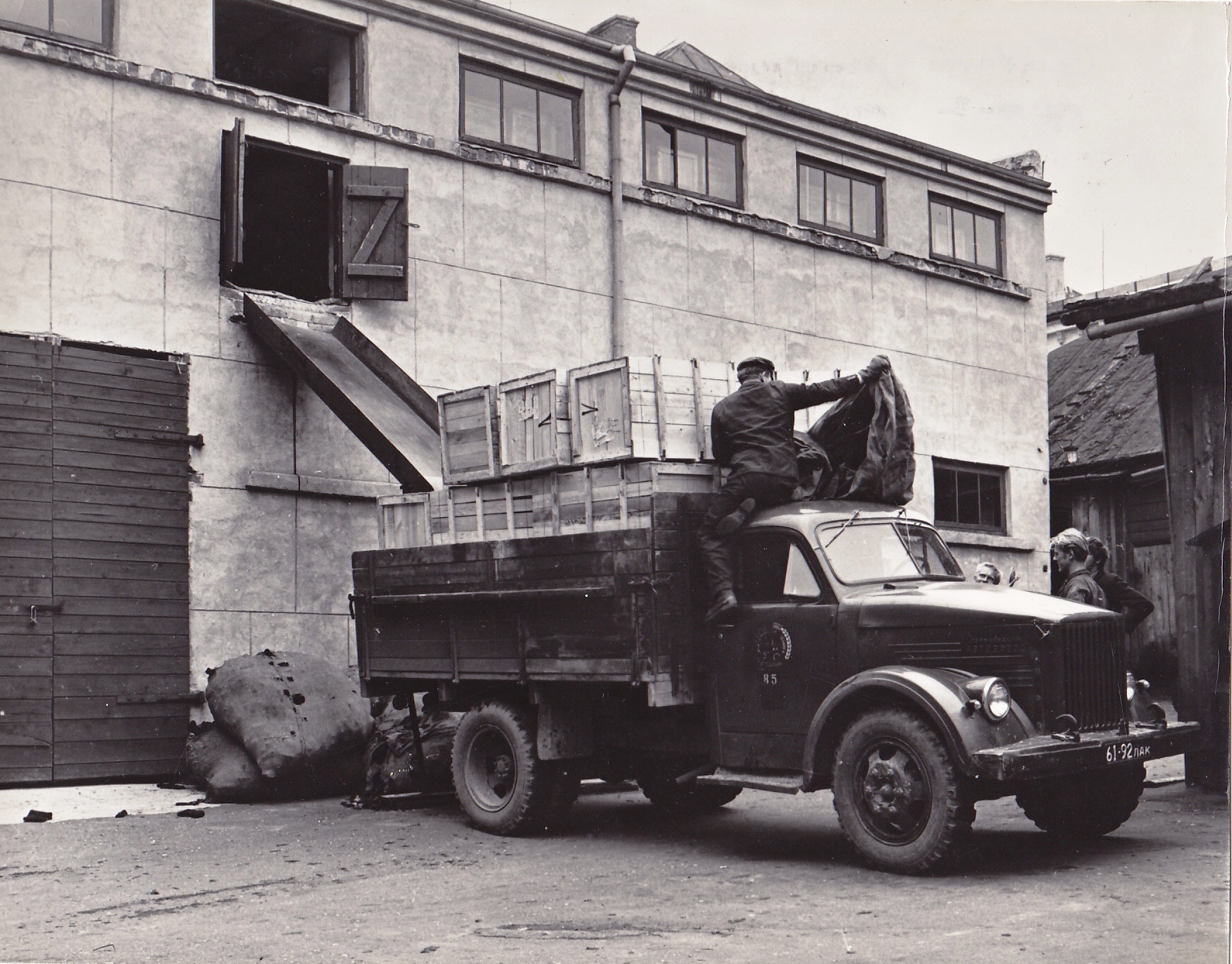 Gatavās produkcijas nosūtīšana no noliktavas fabrikā "Limbažu filcs". Uz automašīnas - krāvējs Arvīds Ozoliņš. 1969. g.