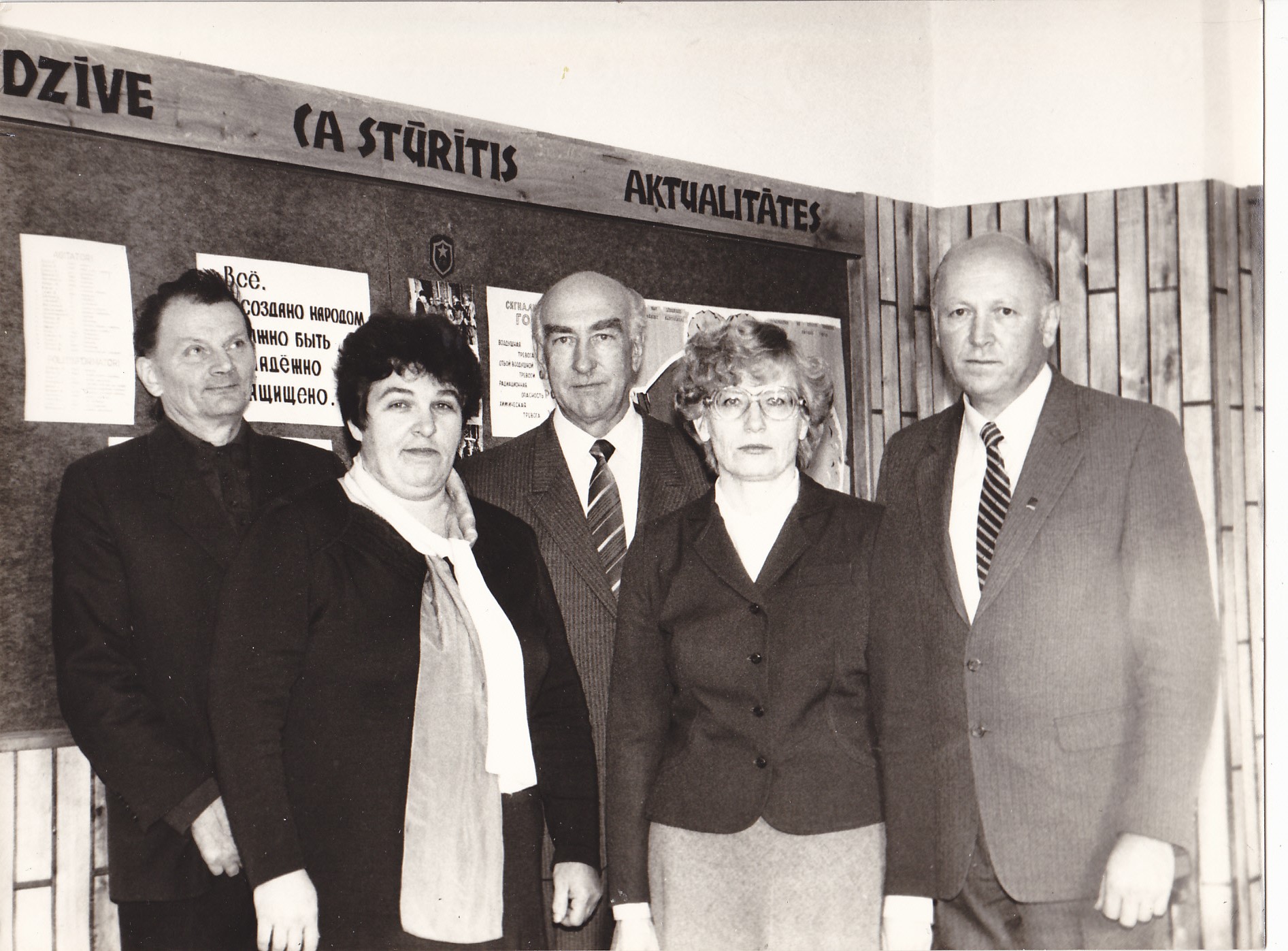 Fabrikas "Limbažu filcs" darbinieki civilās aizsardzības stūrītī. 1970. gadi. No kr. - Jānis Ūdris, Ludmila Grjunberga, Jānis Krastenbergs, Sarmīte Luste un direktors Modris Andreika