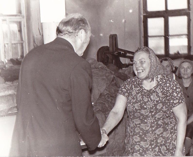 Fabrikas "Limbažu filcs" direktors Modris Andreika apbalvo sociālistiskās sacensības uzvarētāju kārsēju Rasmu Sīmani. 8.01.1981.