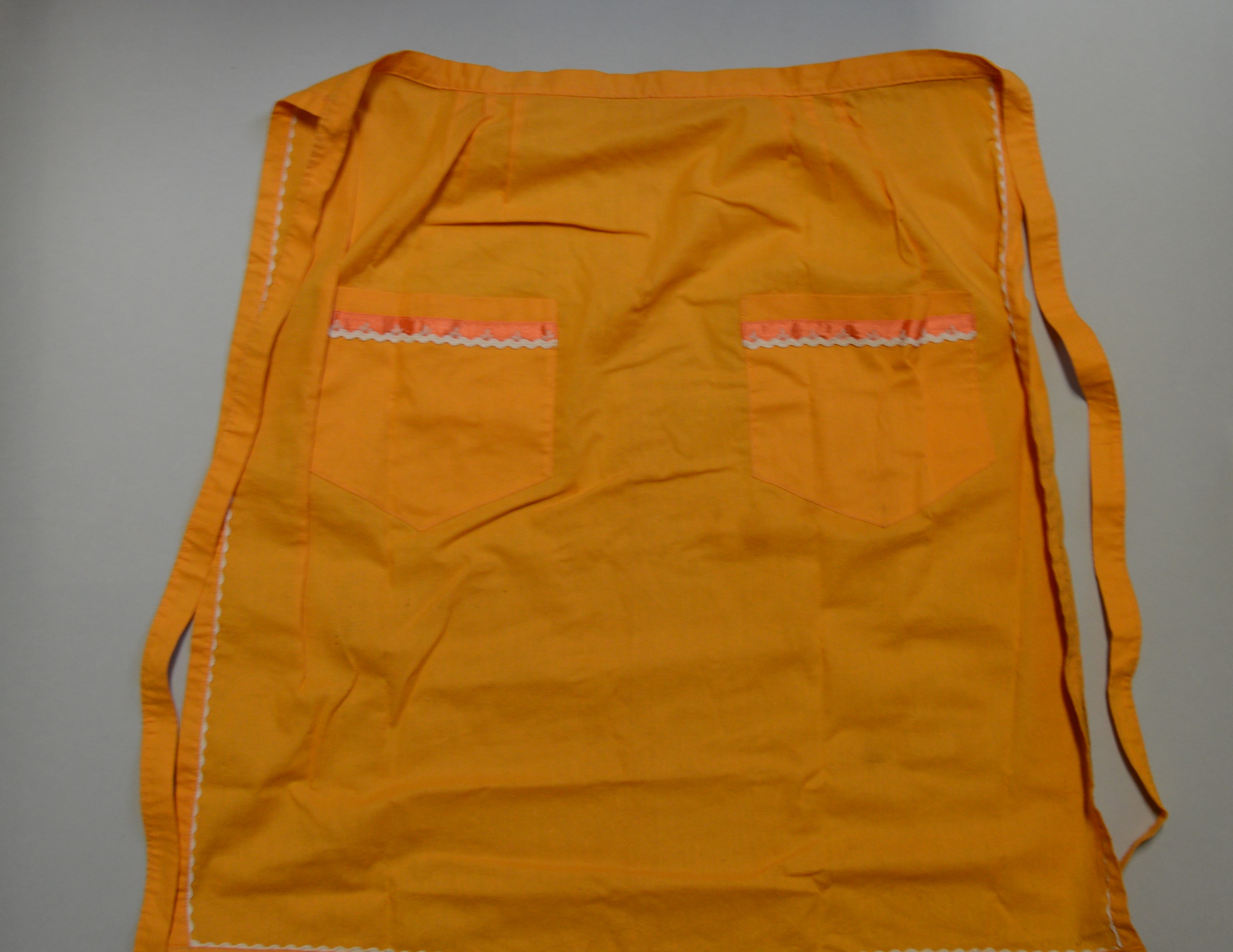 Apelsīnkrāsas ar divām uzšūtām kabatām, apstrādāts ar baltu dekoratīvu lentīti, sasienams aizmugurē ar auduma lentām. Izgatavoja Valentīna Strupka