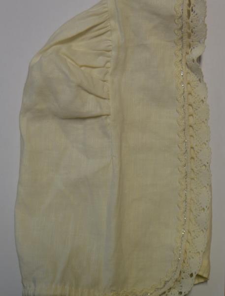 Balta auduma ar savilktu aizmugures daļu un ievilktu baltu lenti, malā apstrādāta ar biezu mežģīni, baltu sutažu un sudrabkāzas brokāta diegu. Izgatavoja Komova