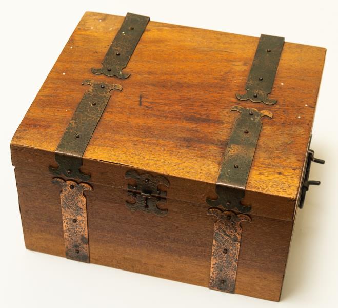 Koka lāde ar metāla apkalumiem, iekspusē kastīte ar nodalījumiem sīku priekšmetu uzglabāšanai.Izgatavots sia "Daiļrade" Viļakas filiālē.izgatavotājs E.Ivanovskis