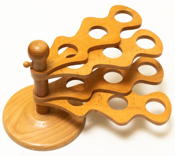 Glāžu turētājs "Ozollapa" 12 glāzītēm, pievienotas 6.Apaļā pamatnē iestiprināts apaļkoks ar noapaļotu galu. Izgatavots Daiļradē Viļakas filiālē. Izgatavotājis A.Golubevs, B.Zelčs