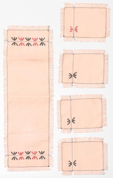 Gaiši rozā krāsā, malas ar bārkstīm, apstrādātas ar zaļu diegu. Celiņš garens, abos galos iestrādāta caurā vīle, gar vīles malām ritmiski ar sarkanas un zaļas krāsas diegiem izšūtas skujiņas, salvetēm vienā galā iestrādāta caurā vīle, vienā malā uzšūtas divas skujiņas, trim salvetēm ar sarkanu un trim salvetēm ar zaļu diegu.