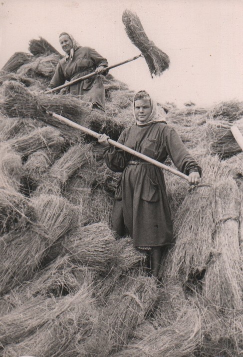 Linu stiebriņu šķirošana Viļakas linu fabrikas teritorijā