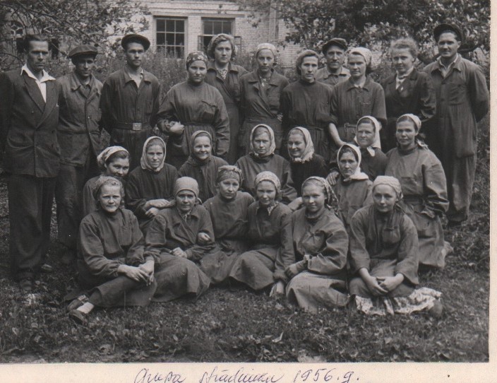 Viļakas linu fabrikas strādnieku grupa, kopā ar darbiniekiem,fotogrāfijas kreisajā malā direktors Maksimenko, otrajā rindā no kreisās pirmā inženiere Ž.Bistrova