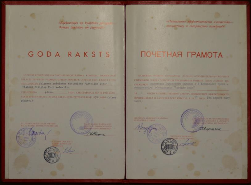 Goda raksts, tiek apbalvots Jelgavas ražošanas apvienības "Latvijas lini" Viļakas filiāles Nr.8 kolektīvs par izcīnīto 1.vietu sabiedriskajā skatē par ražošanas efektivitātes un visa darba kvalitātes celšanu 1977.gadā