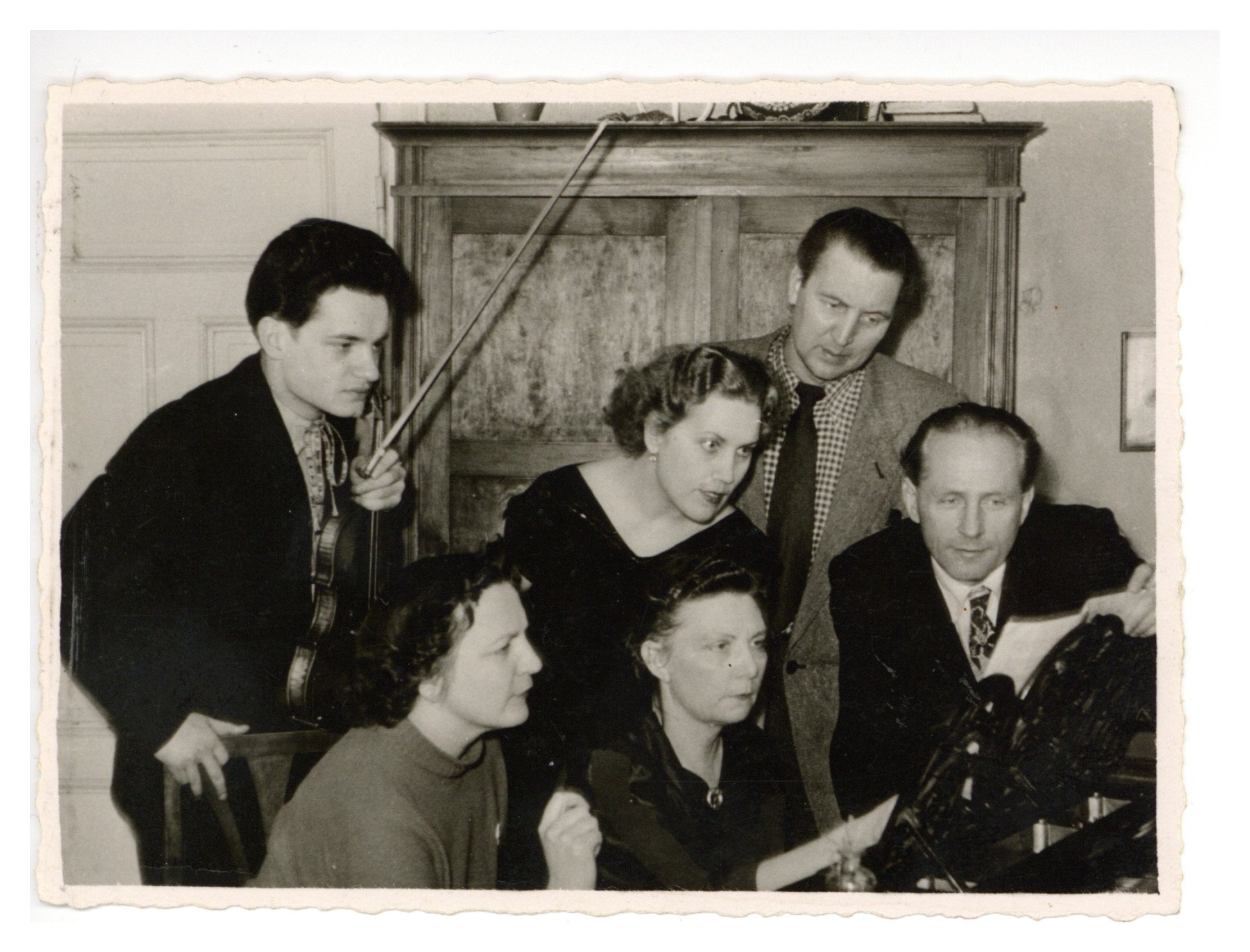 Gatavojoties Laumas Reinholdes autorkoncertam 27.III.1958.g. LVK Zālē. Sēž no kreisās puses: Irēna Donava, Lauma Reinholde. Stāv no kreisās puses: Juris Švolkovskis, Anita Sevele, Ilmārs Šēnfelds, Hermanis Mikalajunas.