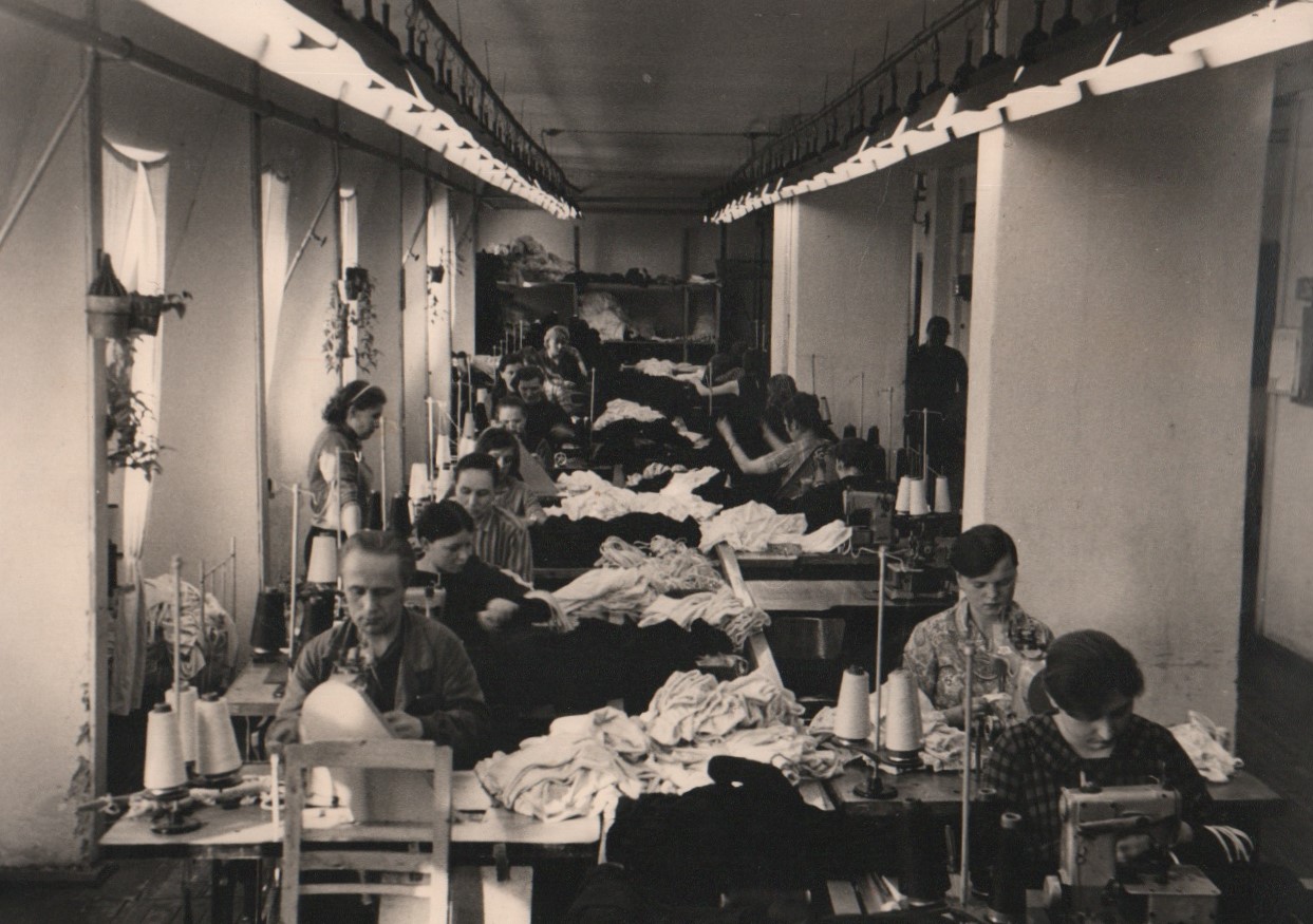 Ražošanas apvienības "Sarkanais rīts" šūšanas ceha iekšskats, pie darba galda priekšā pa labi Svetlana Aksonova, aizmugurē Emerita Šaicāne. Šuva sporta tērpus un apakšveļu.
