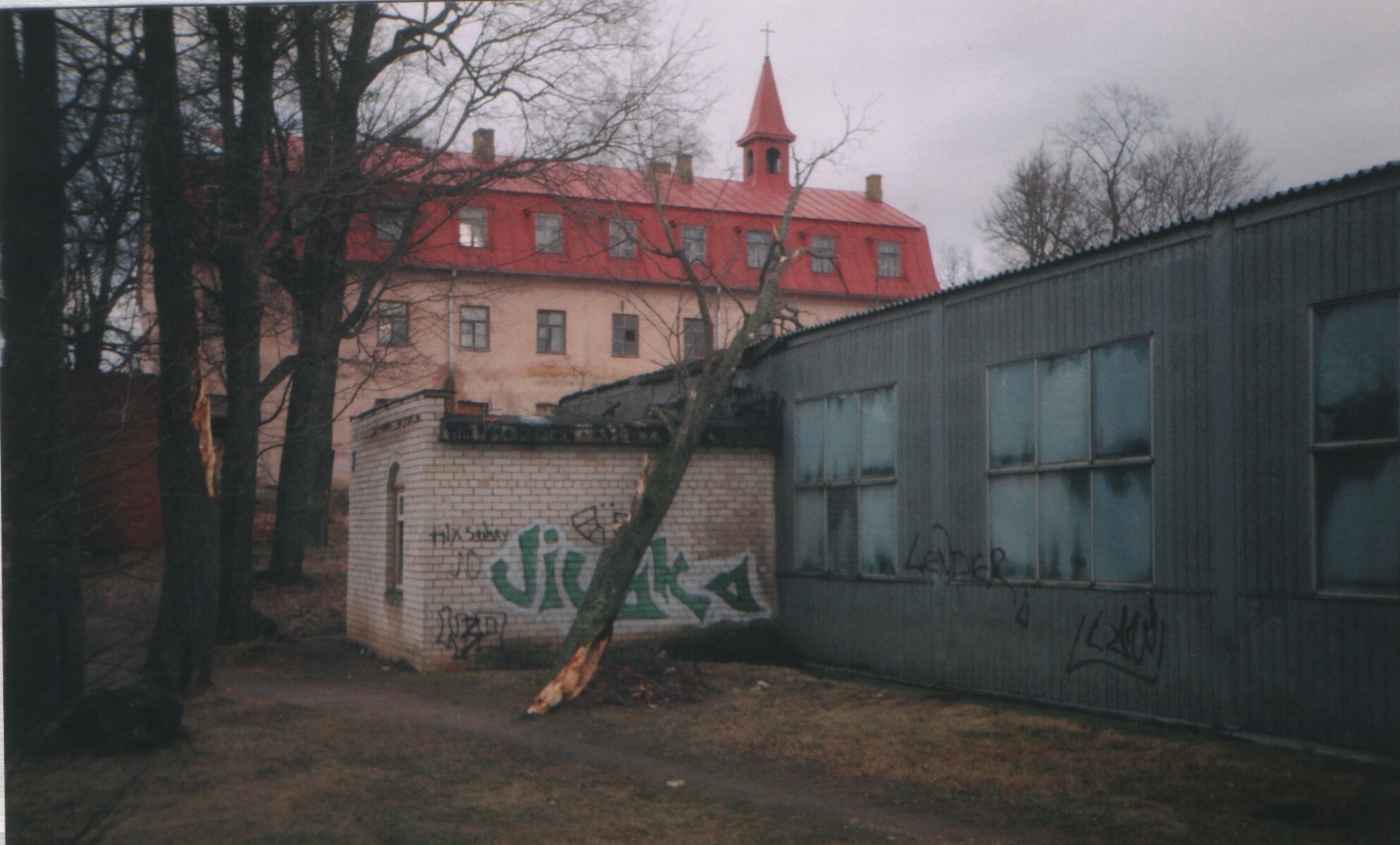 Šūšanas ceha "Sarkanais rīts" filiale Viļakā. Skats uz pašu ēku un piebūvēto korpusu. Fotografēts pēc vētras pilsētā.