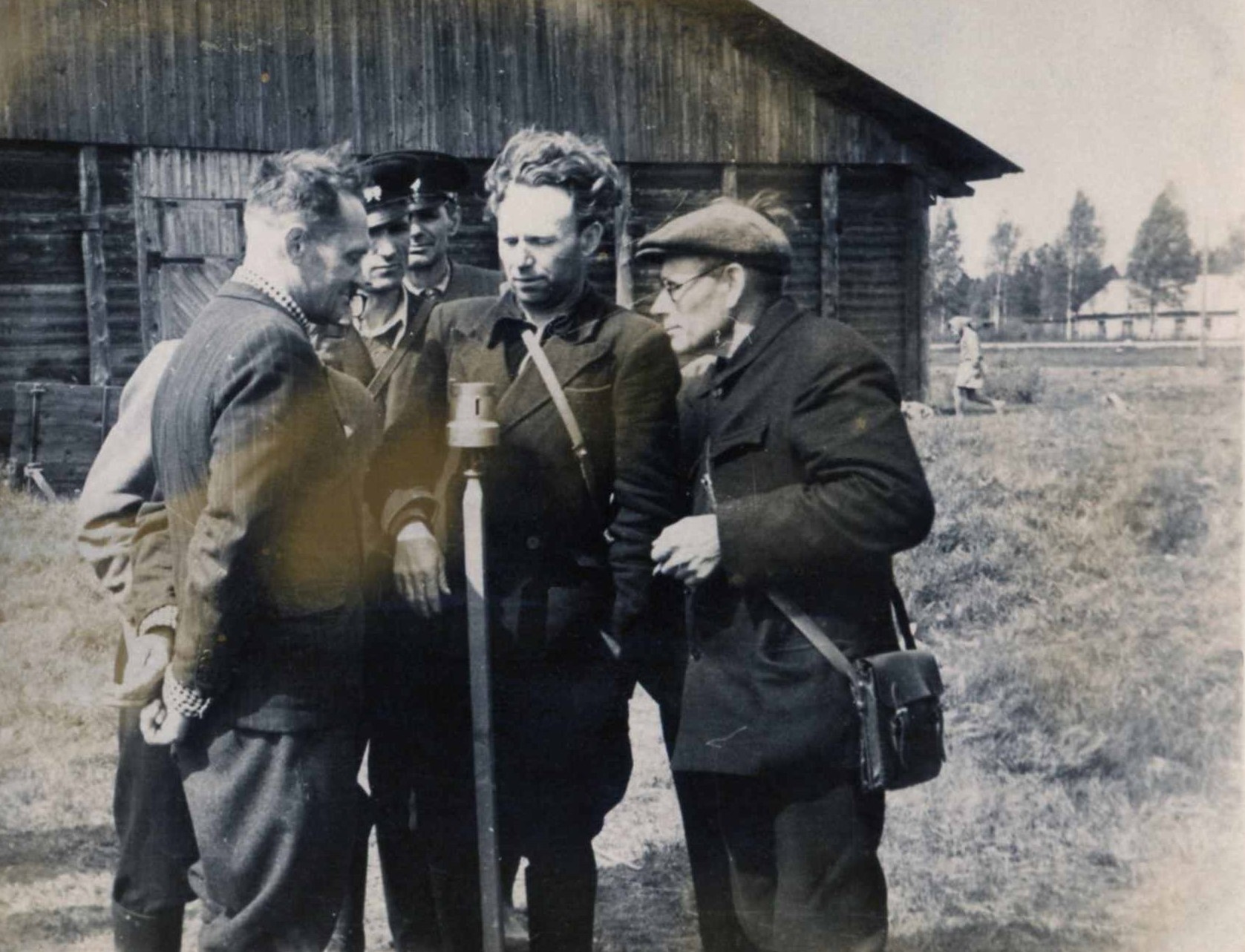 Mežsargi ap leņķa mērinstrumentu - busoli. Aizmugurē vecā pārtikas noliktava, kura atradās uz rietumiem aiz MRS kantora